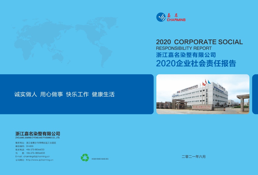 《浙江嘉名控股有限公司2020企業(yè)社會責任報告》本著客觀、透明、誠信、規(guī)范的原則編寫,從責任管理、誠信建設、價值創(chuàng)造、綠色環(huán)保、安全生產(chǎn)、垃圾分類、員工權益、黨群工作、企業(yè)文化、社會公益等責任和行動出發(fā),以豐富的內(nèi)容、翔實的數(shù)據(jù)和真實的業(yè)績,全面展示了2019-2020年公司打造實力嘉名、創(chuàng)新嘉名、誠信嘉名、綠色嘉名、和諧嘉名的實踐情況,彰顯了公司為早日實現(xiàn)“致力成為國內(nèi)外知名服裝品牌的首選面料供應商”的嘉名夢的信心和決心,更向社會公眾呈現(xiàn)了嘉名作為一家民營企業(yè)為履行社會責任,推動行業(yè)和當?shù)厣鐣目沙掷m(xù)發(fā)展所做出的努力及責任擔當。