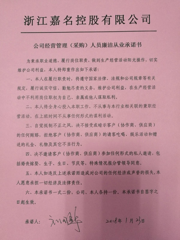 1月23日,公司召開經(jīng)營管理(采購)人員廉潔從業(yè)承諾書簽訂會議,11名公司廉潔風險重點崗位的經(jīng)營管理(采購)人員參加會議,并簽訂了廉潔從業(yè)承諾書。公司莫總和黨建指導員吳紀聯(lián)分別講話。